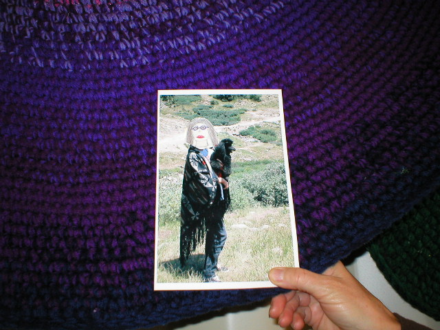 Model of the Year When "Alice" saw Mrs. Frink model her coat, she, too, wanted to model something. She was lucky because Judy had a shawl just her size that was waiting for her!! Note how well it fits and how pleased she looks in it! (We still haven't figured out where the dog fits in....????) |