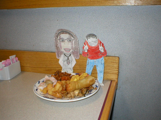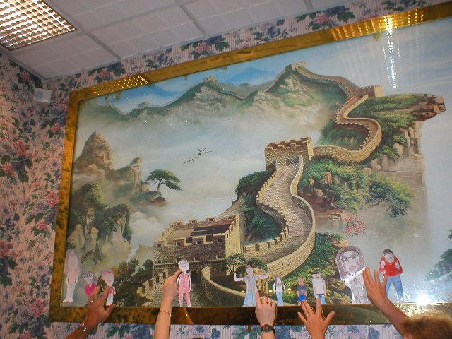 Climbing the Great Wall of China "Patrick" leads the way up the Great Wall of China as the rest of the Flat People follow. When the walk was over, they all sat down with the Frinks and enjoyed a wonderful meal at the China Wok Buffet on Menaul in Albuquerque. Most everyone ate everything on their plate......except... |
