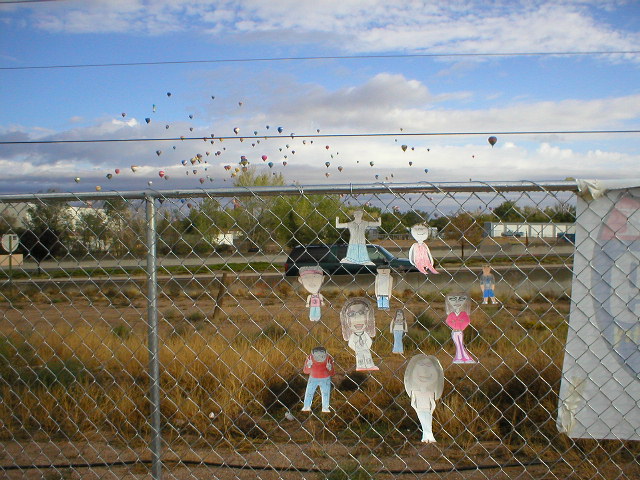 To Get a Better View.... The Flat People climb the fence to get a better view of the balloon launch on Sunday. Over 700 hot air balloons were in the air over Albuquerque and the Flat People were a part of all the excitement! The trip was a long and hard one, but it was well worth the experience and they look forward to other excitings adventures (after a much deserved rest at home for awhile)! |