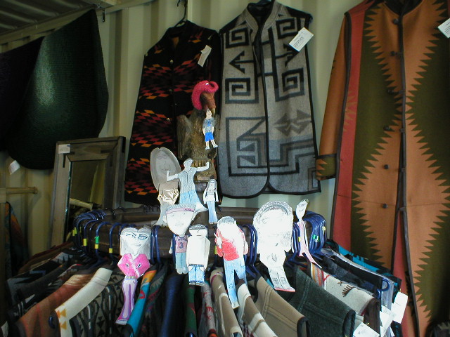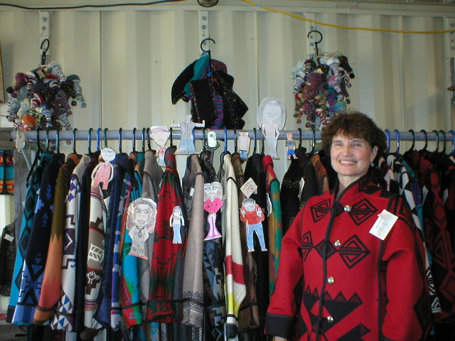 Help with "Coat Decisions" The Flat People went to the booth of Judy and Don Fite, owners of Solarado Specialties out of Olathe, Colorado. They helped Mrs. Frink pick out a long Pendleton wool coat. Each one is sitting on a choice, but in the end, they decided on this red one. It will take a few weeks for Judy to make it, but when it is finished, Mrs. Frink will model it for the class. |